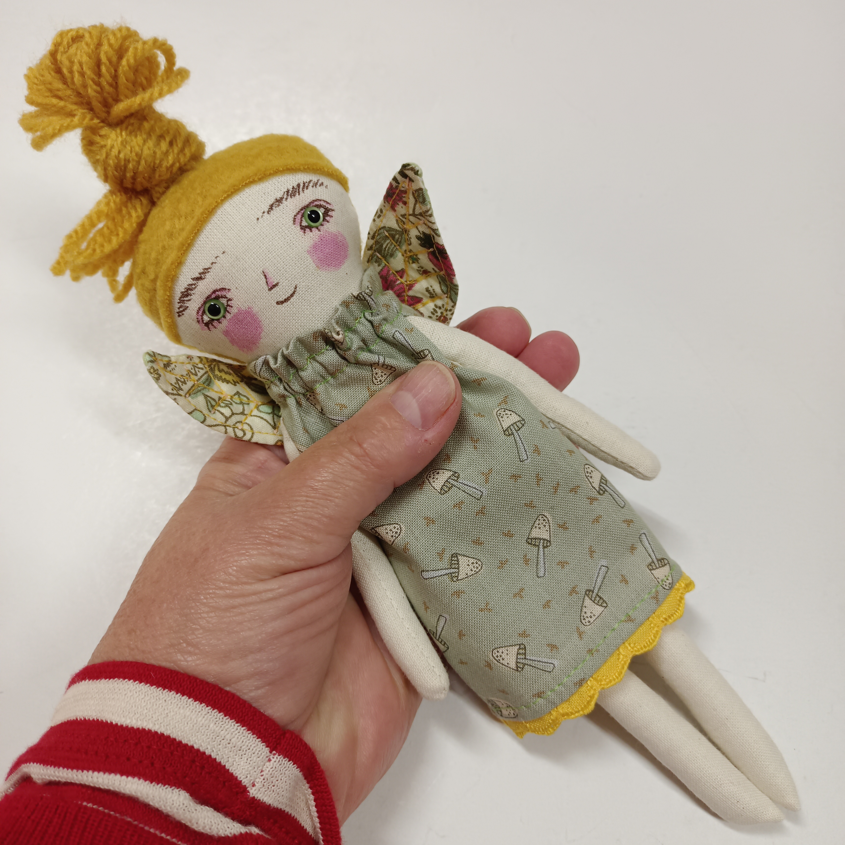 … malá panenka je ušitá z bavlněných látek. Vlasy jsou z fleece a pletací příze a mohou se různě upravovat.