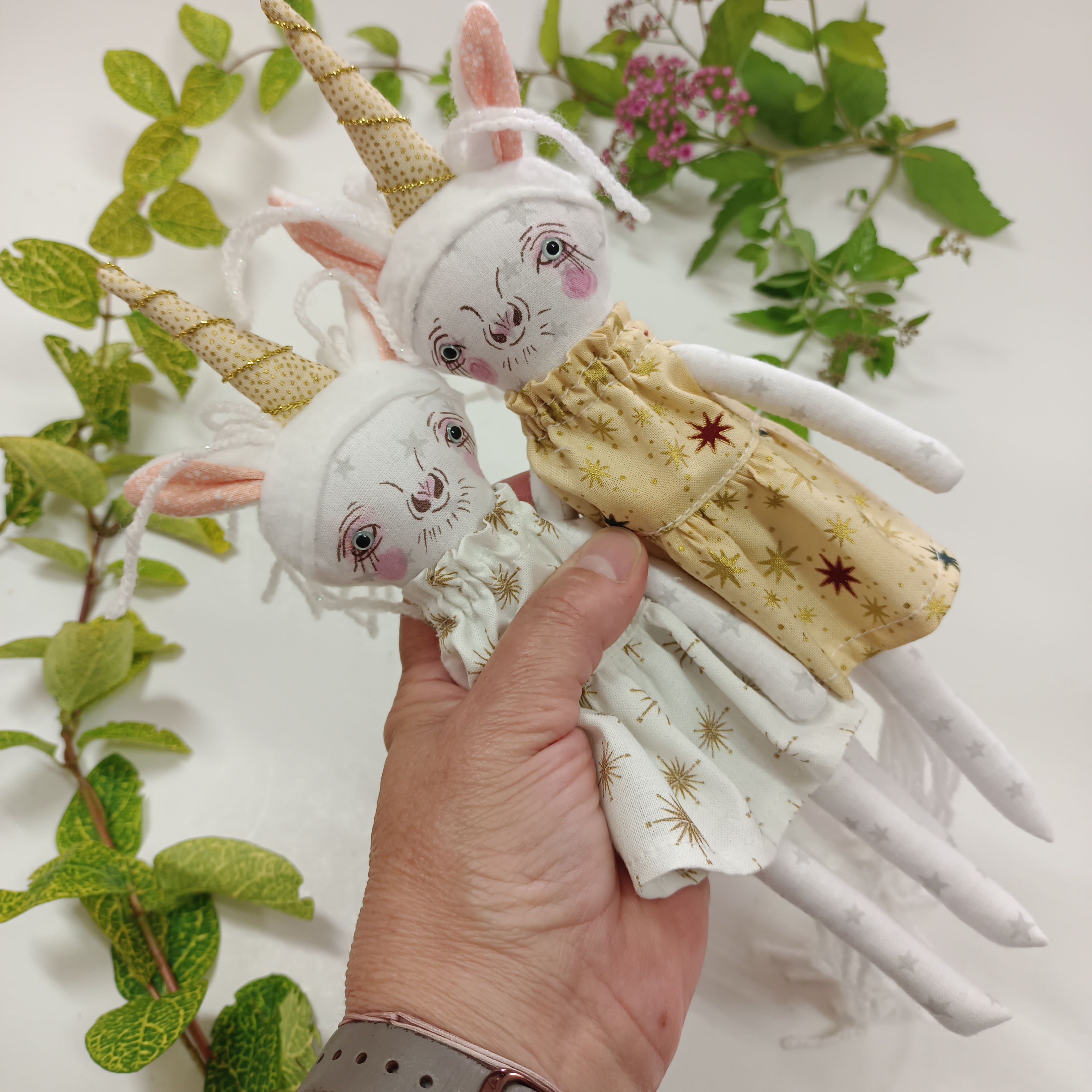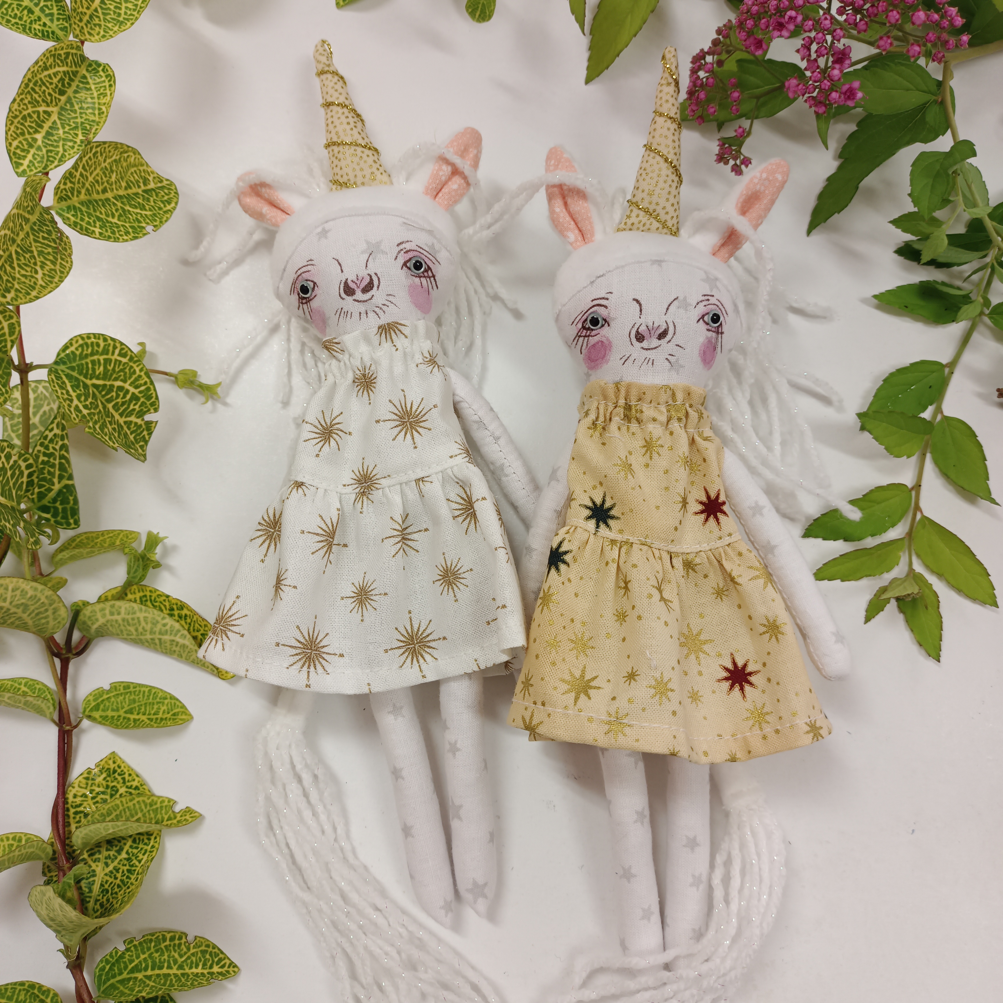 … malá panenka je ušitá z bavlněných látek. Ouška jsou z fleece, hříva a střapec ocásku jsou z pletací příze.