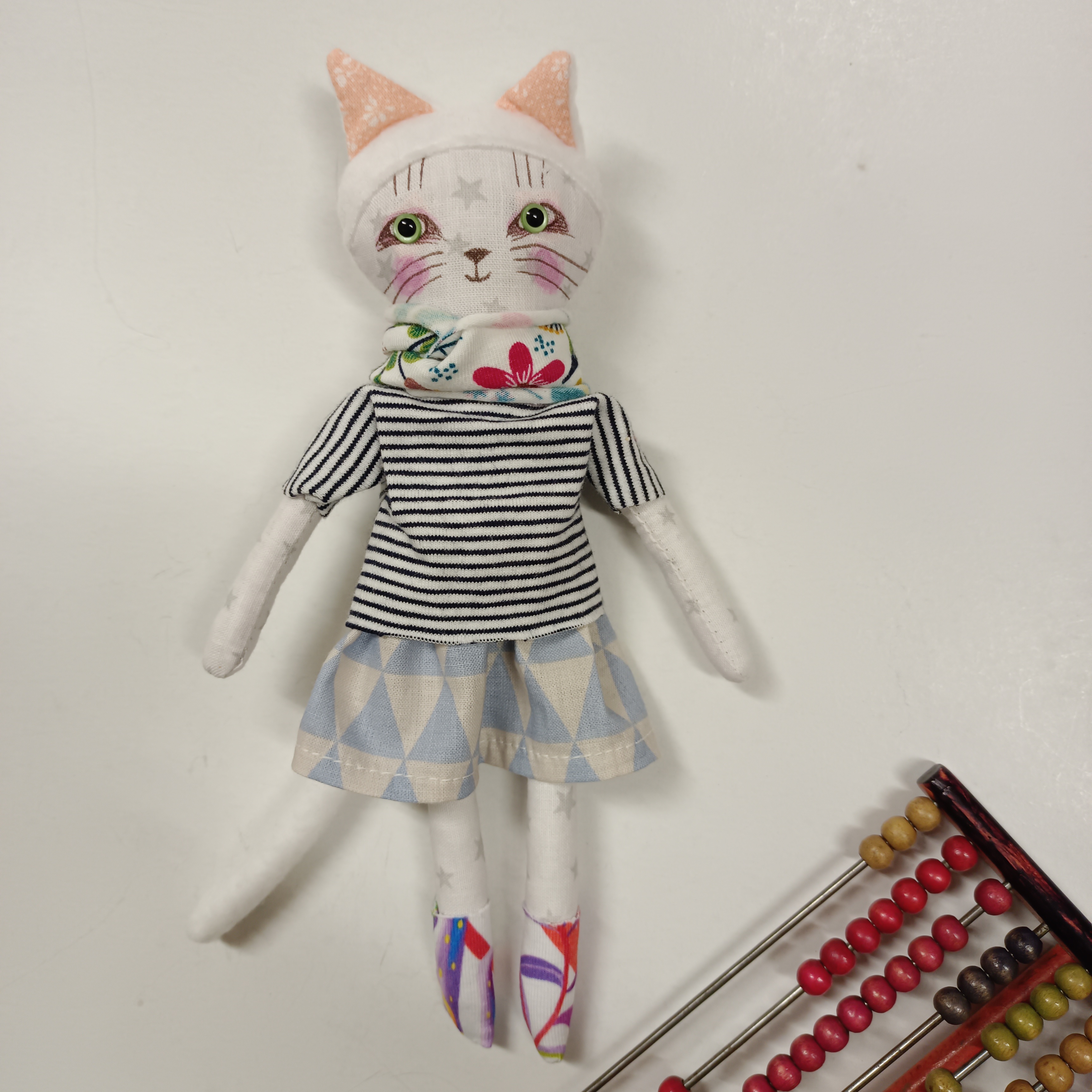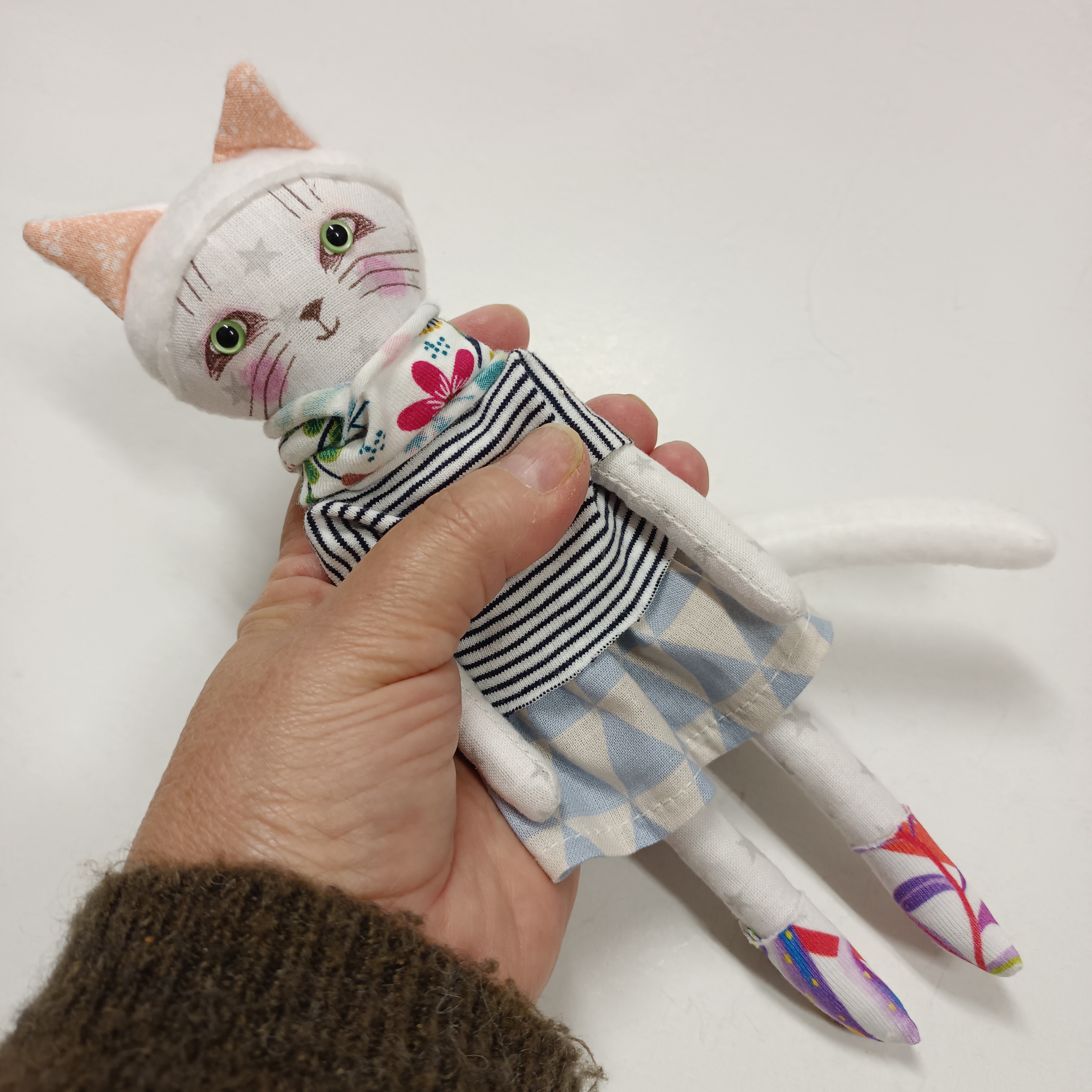 … malá panenka je ušitá z bavlněných látek. Ouška a ocásek jsou z fleece.