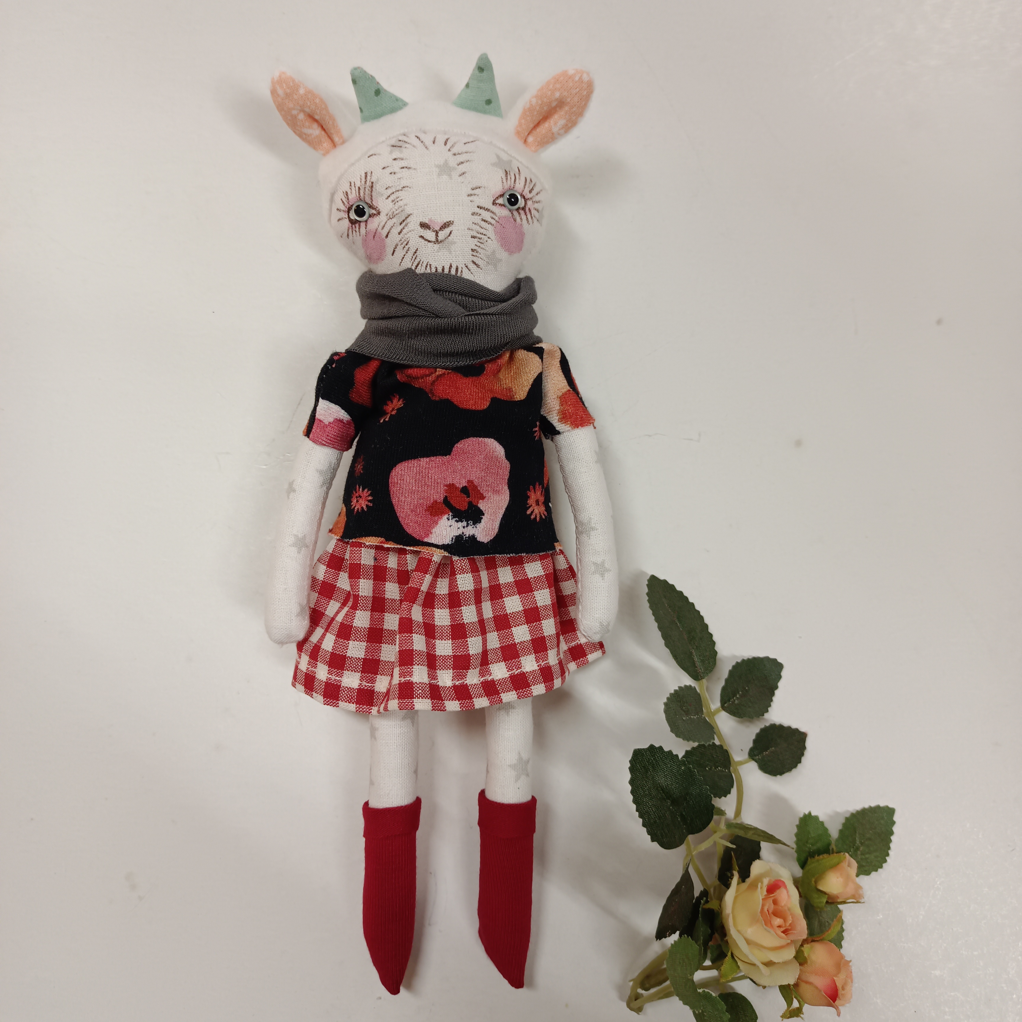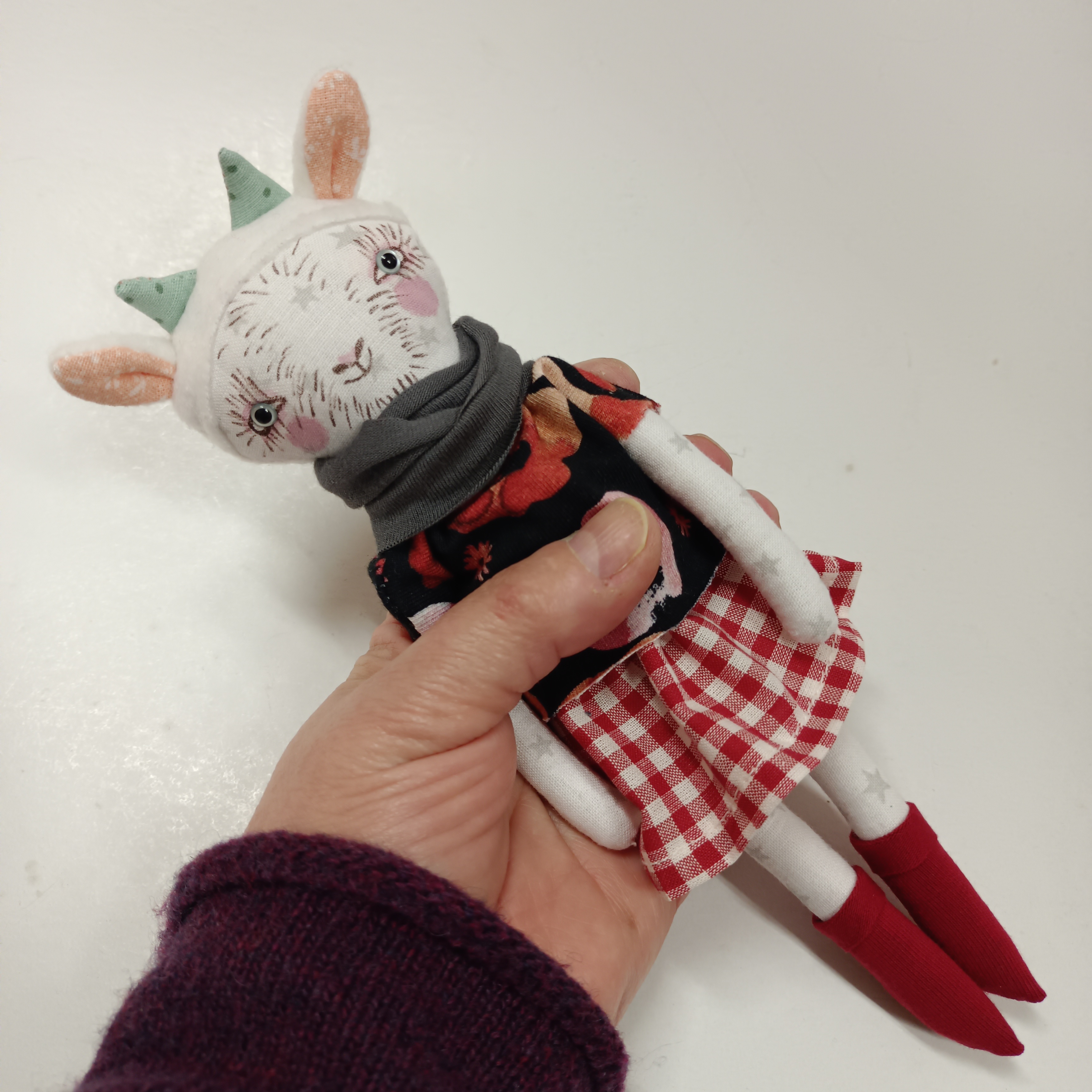 … malá panenka je ušitá z bavlněných látek. Ouška a ocásek jsou z fleece.