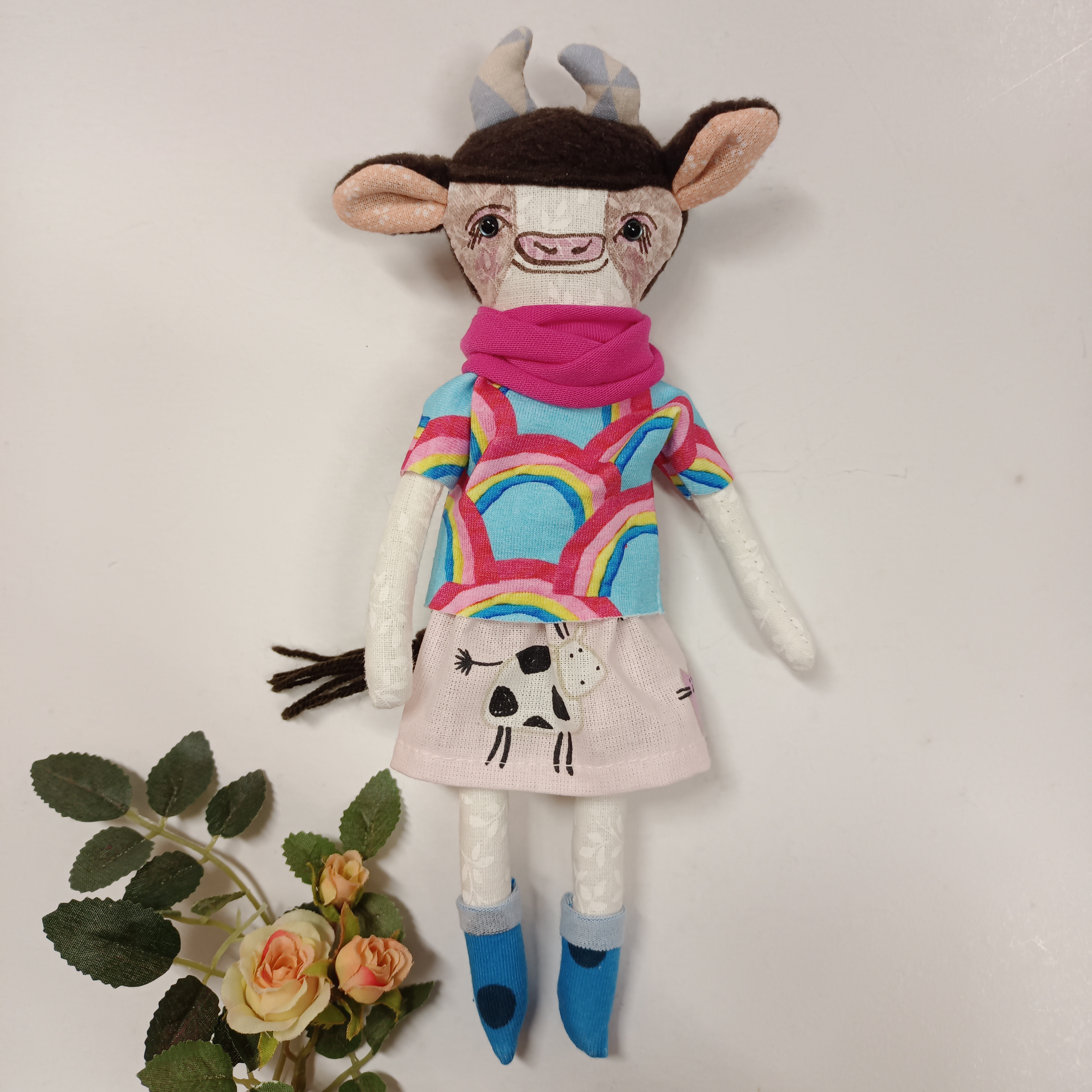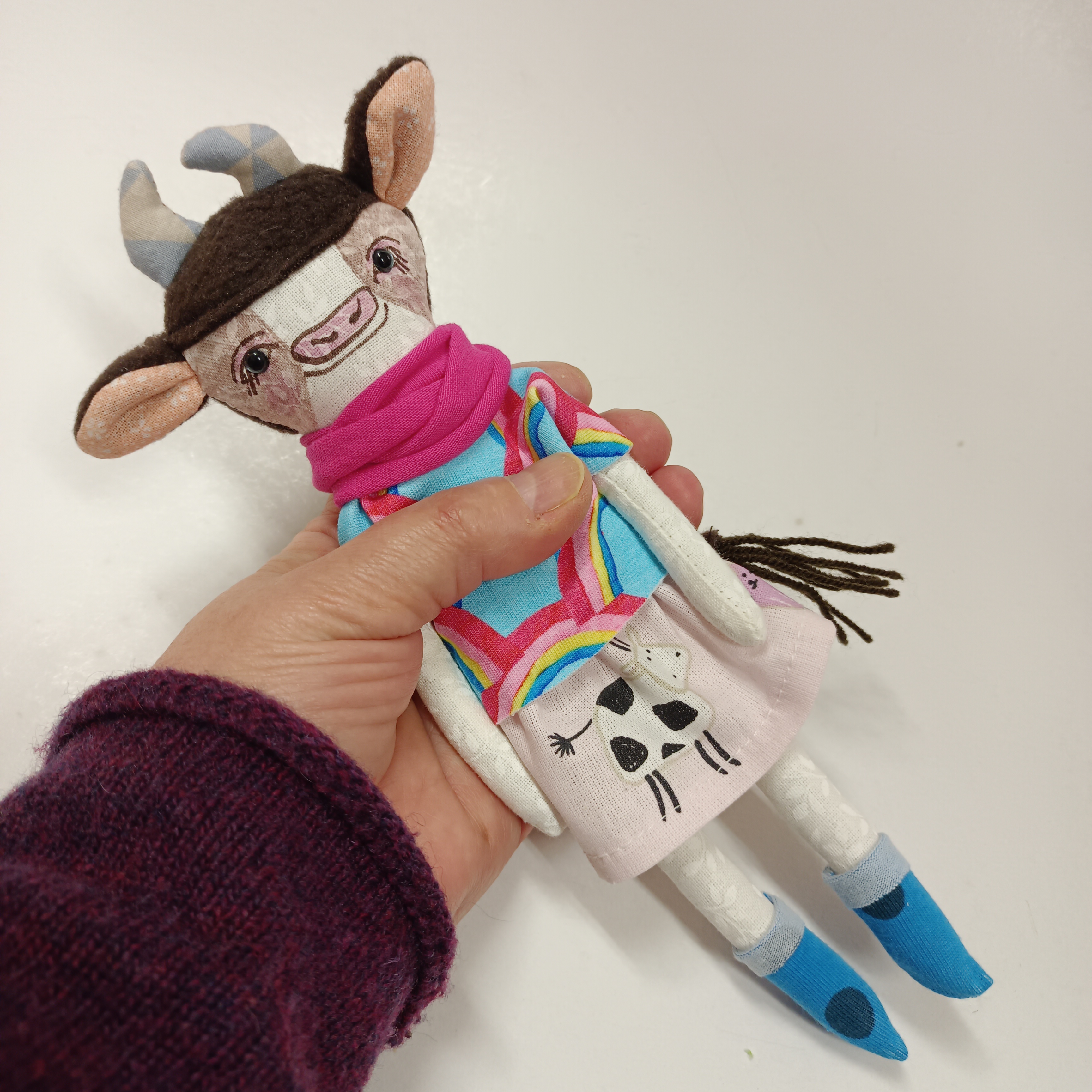 … malá panenka je ušitá z bavlněných látek. Ouška a ocásek jsou z fleece a pletací příze.