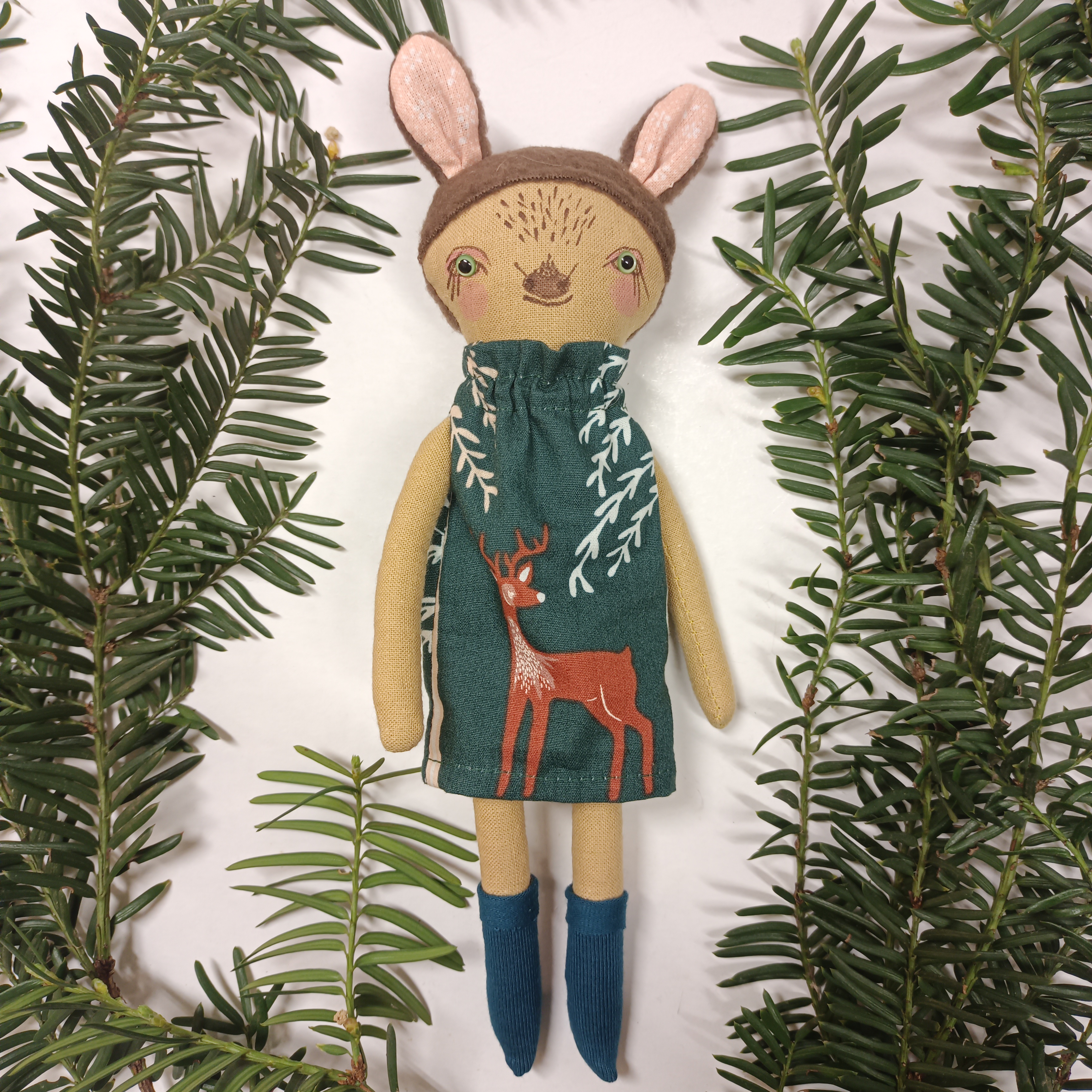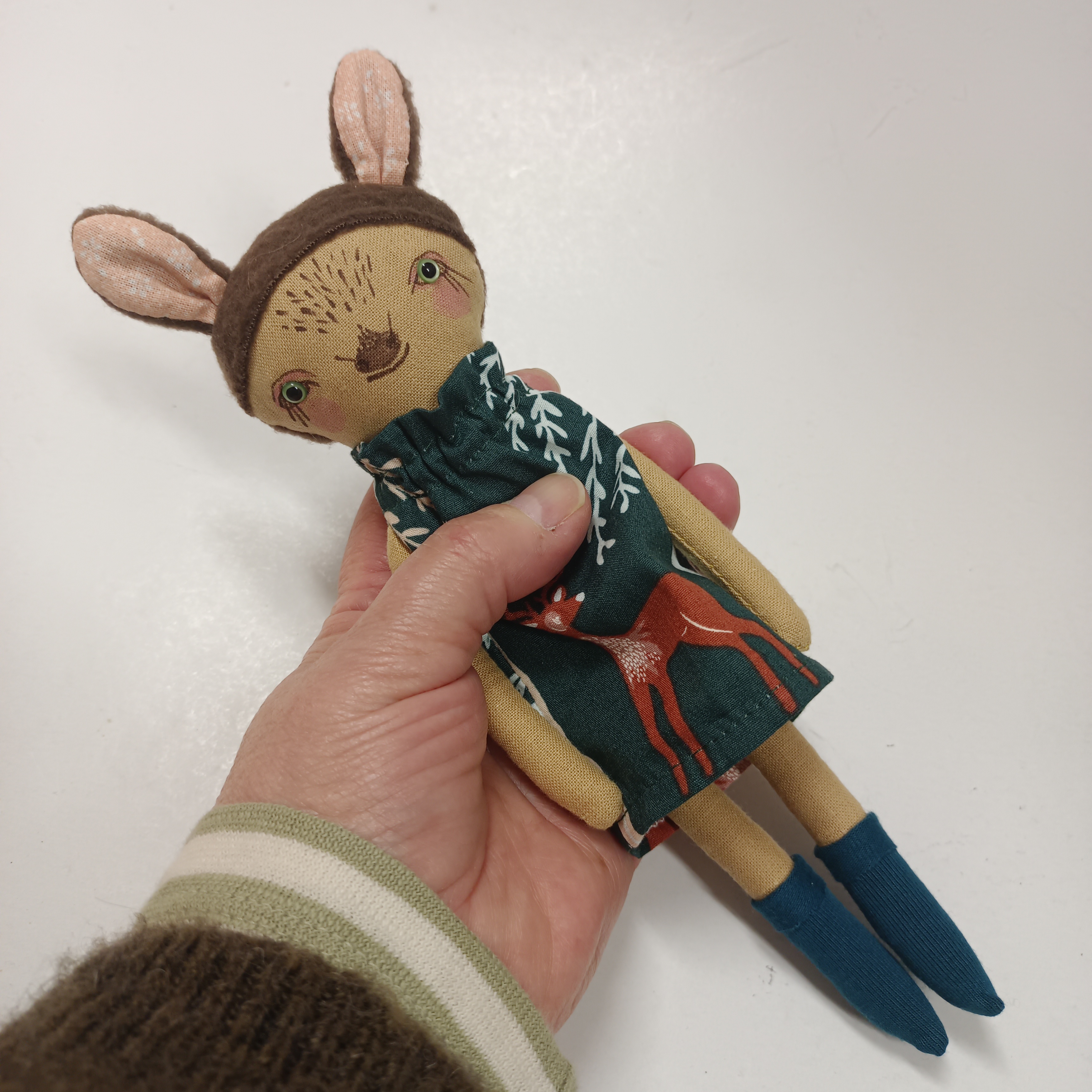 … malá panenka je ušitá z bavlněných látek. Ouška a ocásek jsou z fleece.