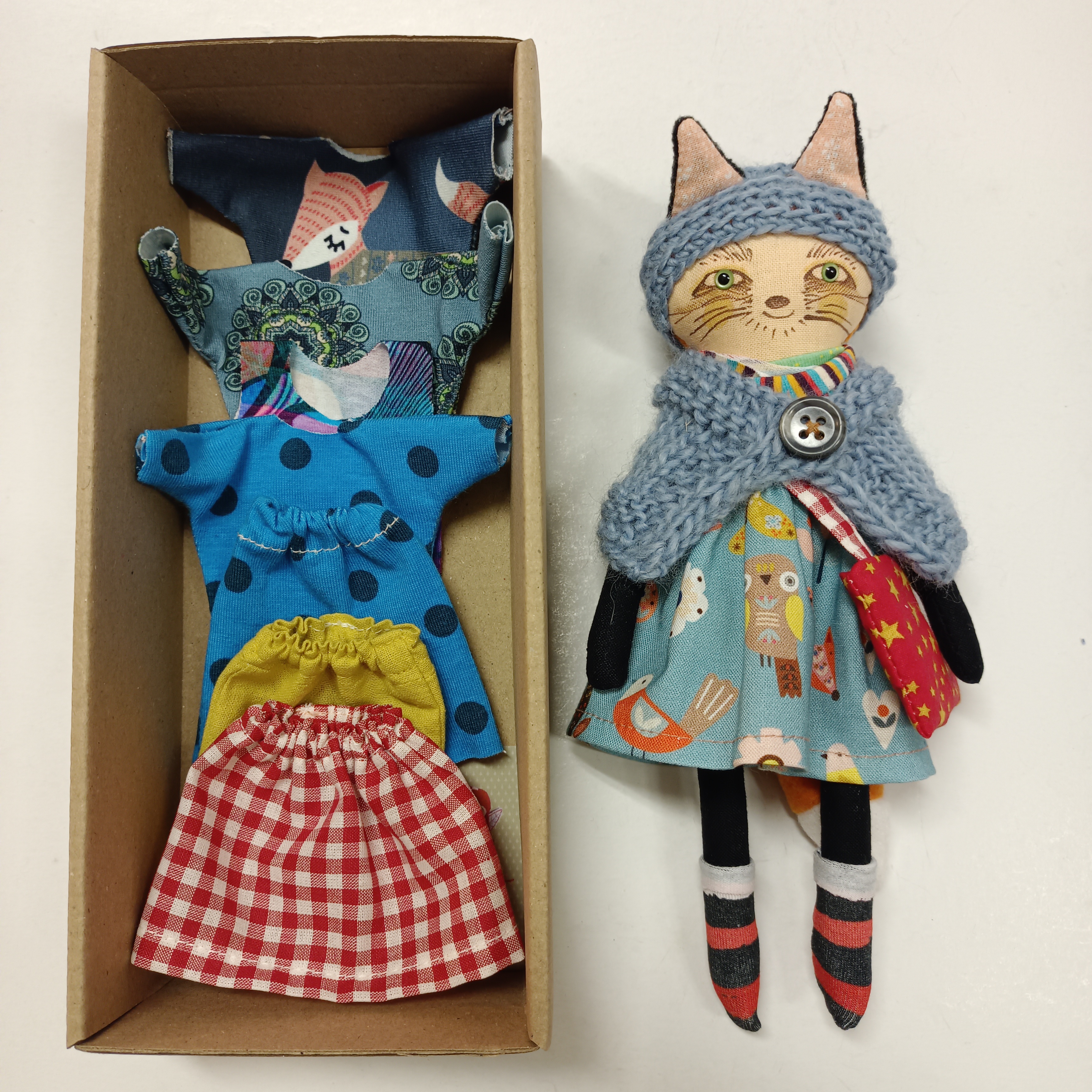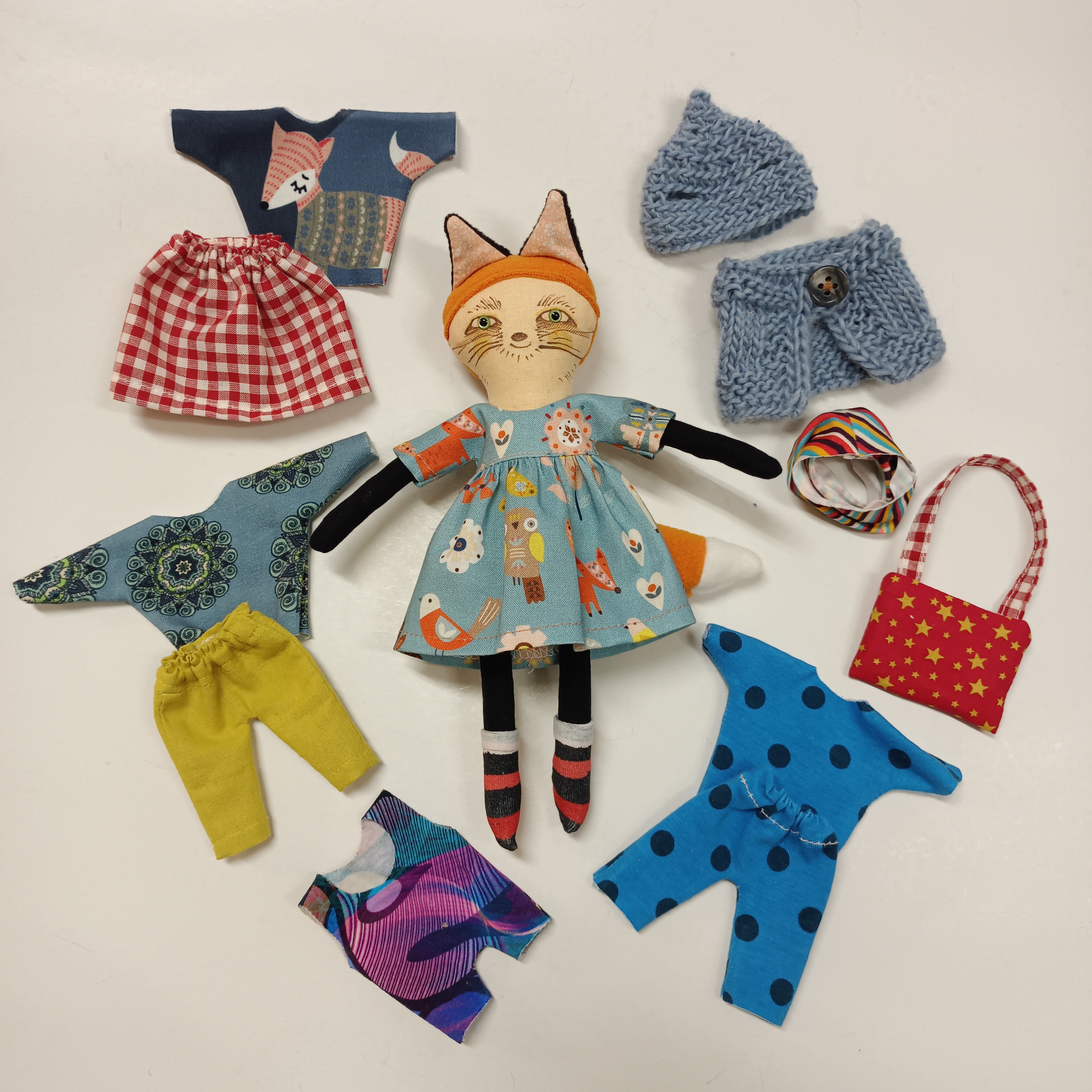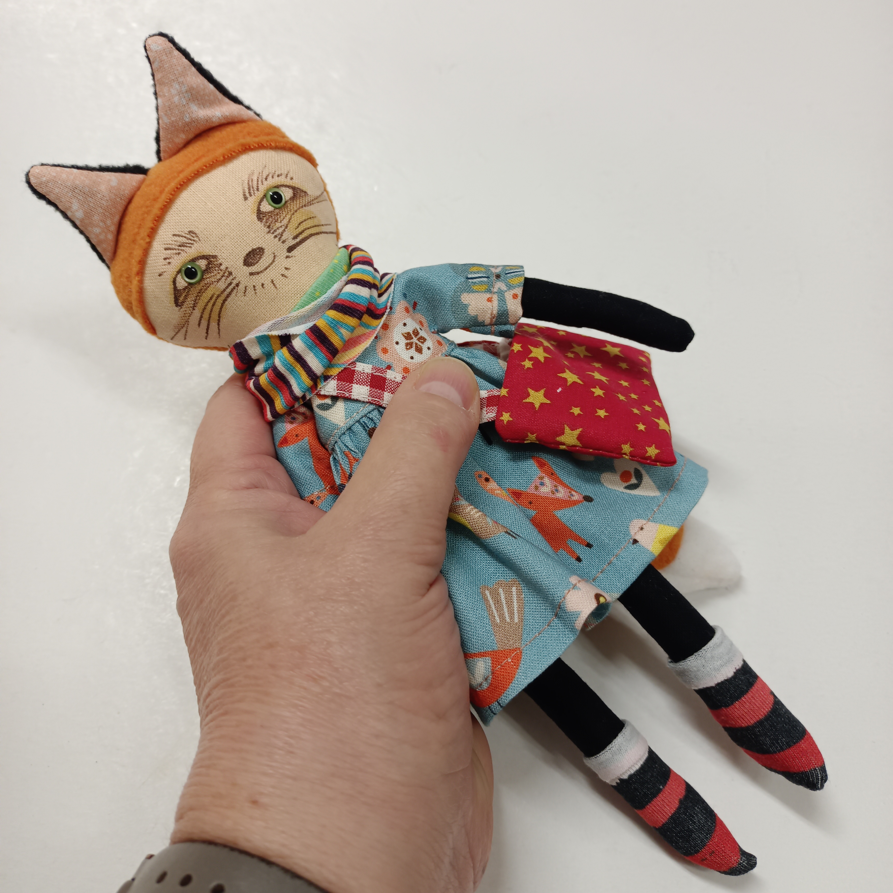 … malá panenka je ušitá z bavlněných látek. Ouška a ocásek jsou z fleece.