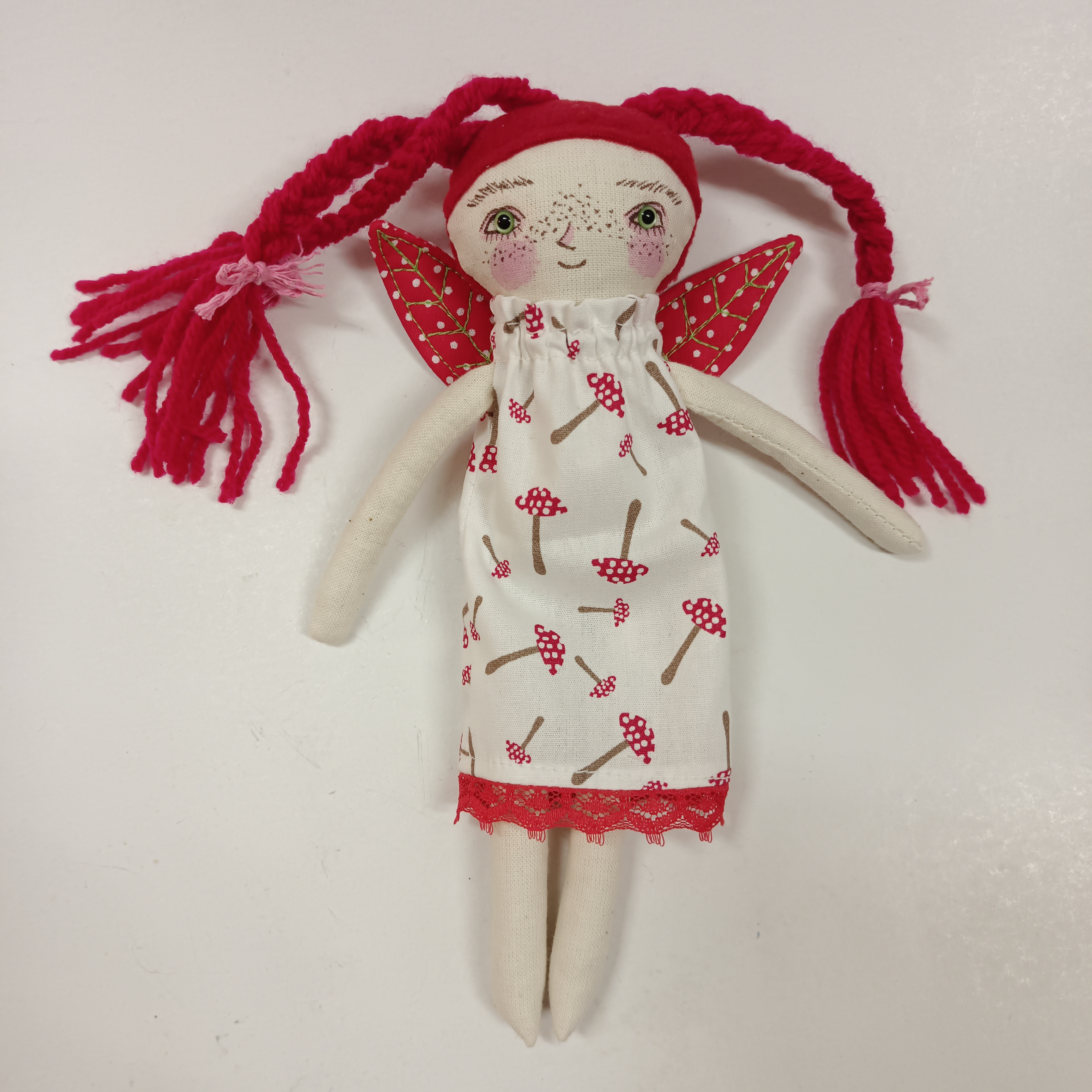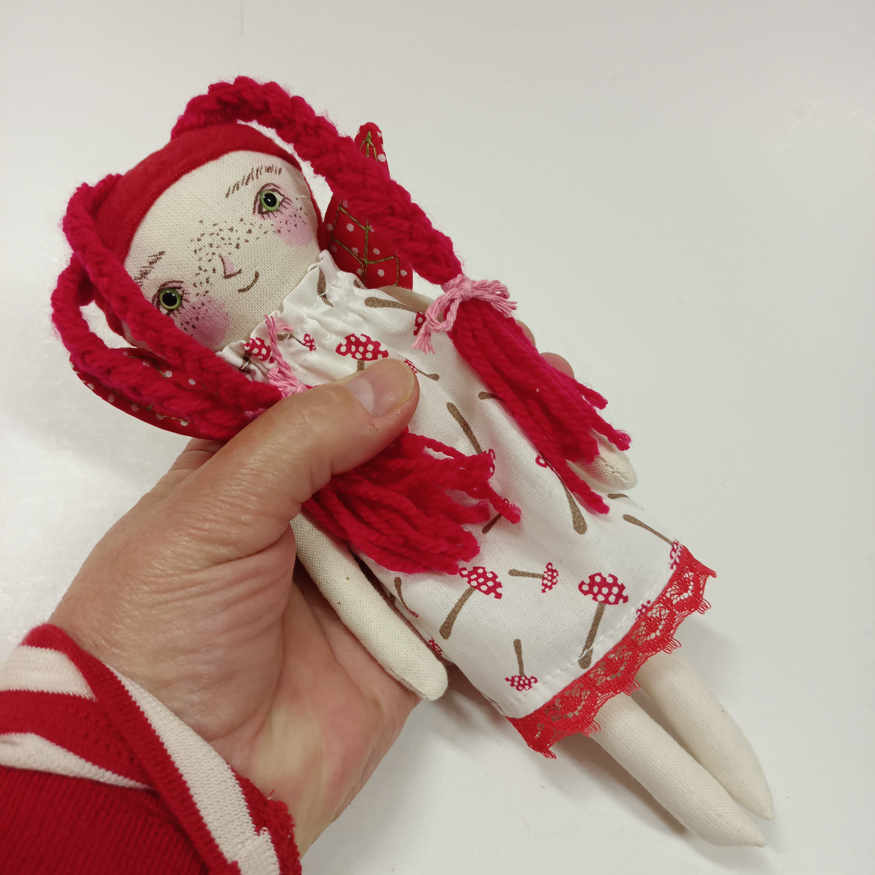 … malá panenka je ušitá z bavlněných látek. Vlasy jsou z fleece a pletací příze a mohou se různě upravovat.