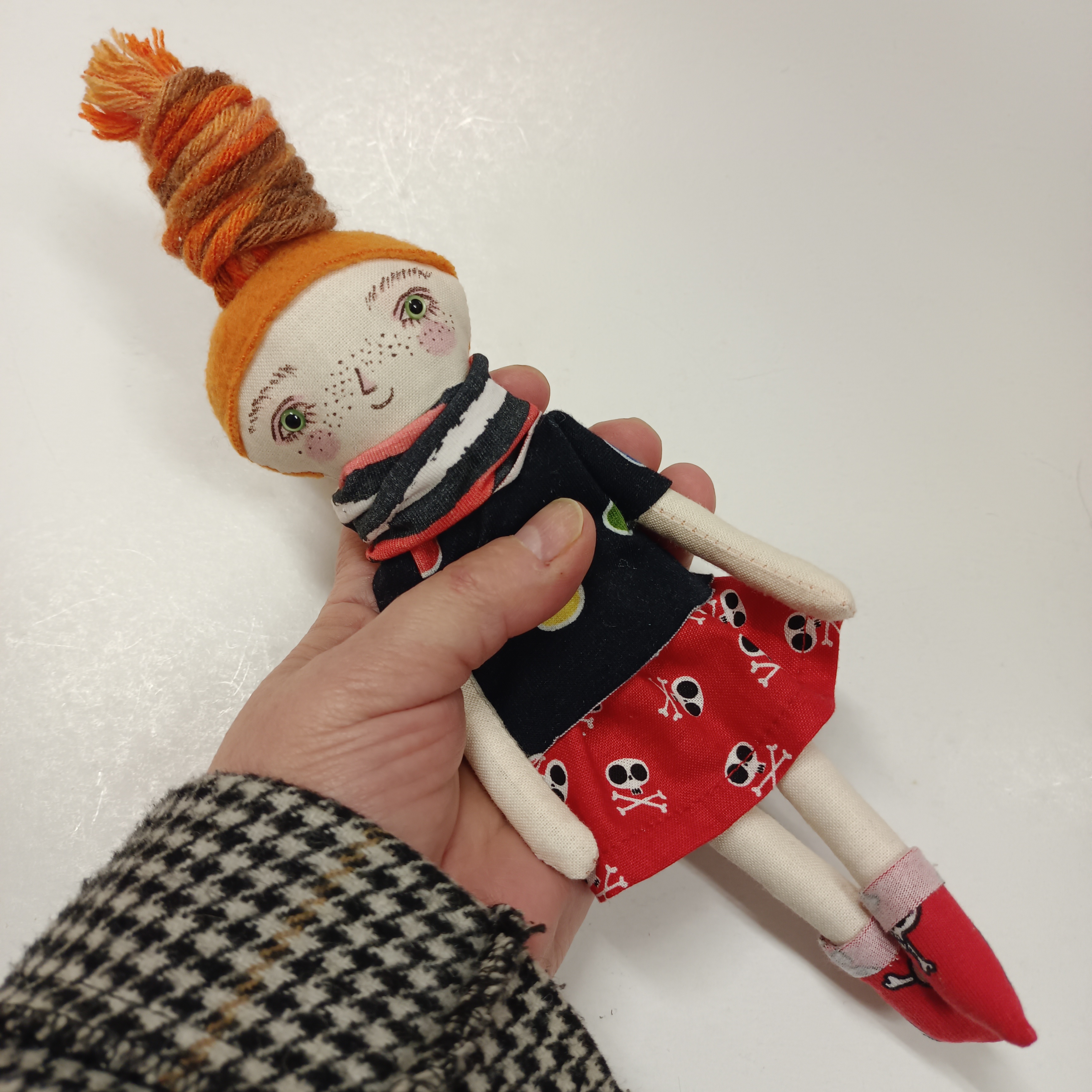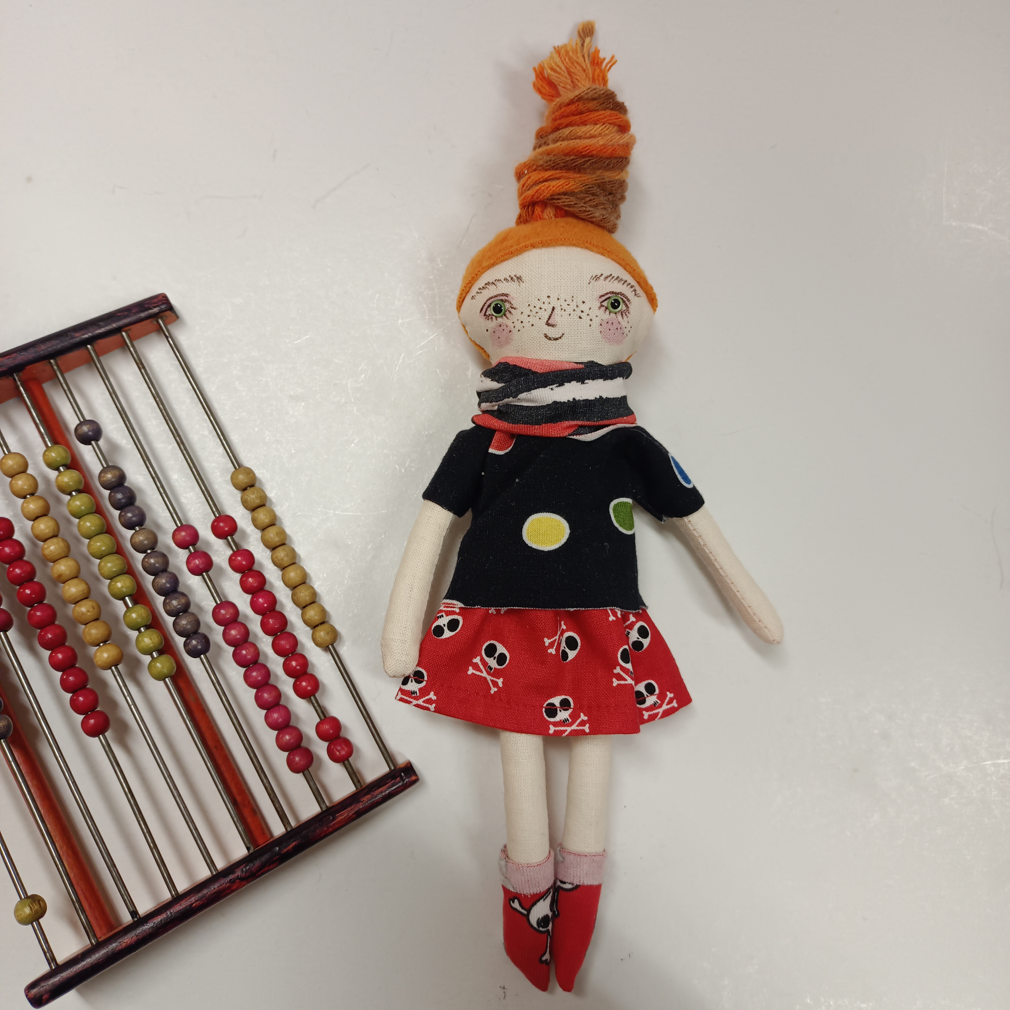 … malá panenka je ušitá z bavlněných látek. Vlasy jsou z fleece a pletací příze a mohou se různě upravovat – culíky, copy, drdůlky, uzly.