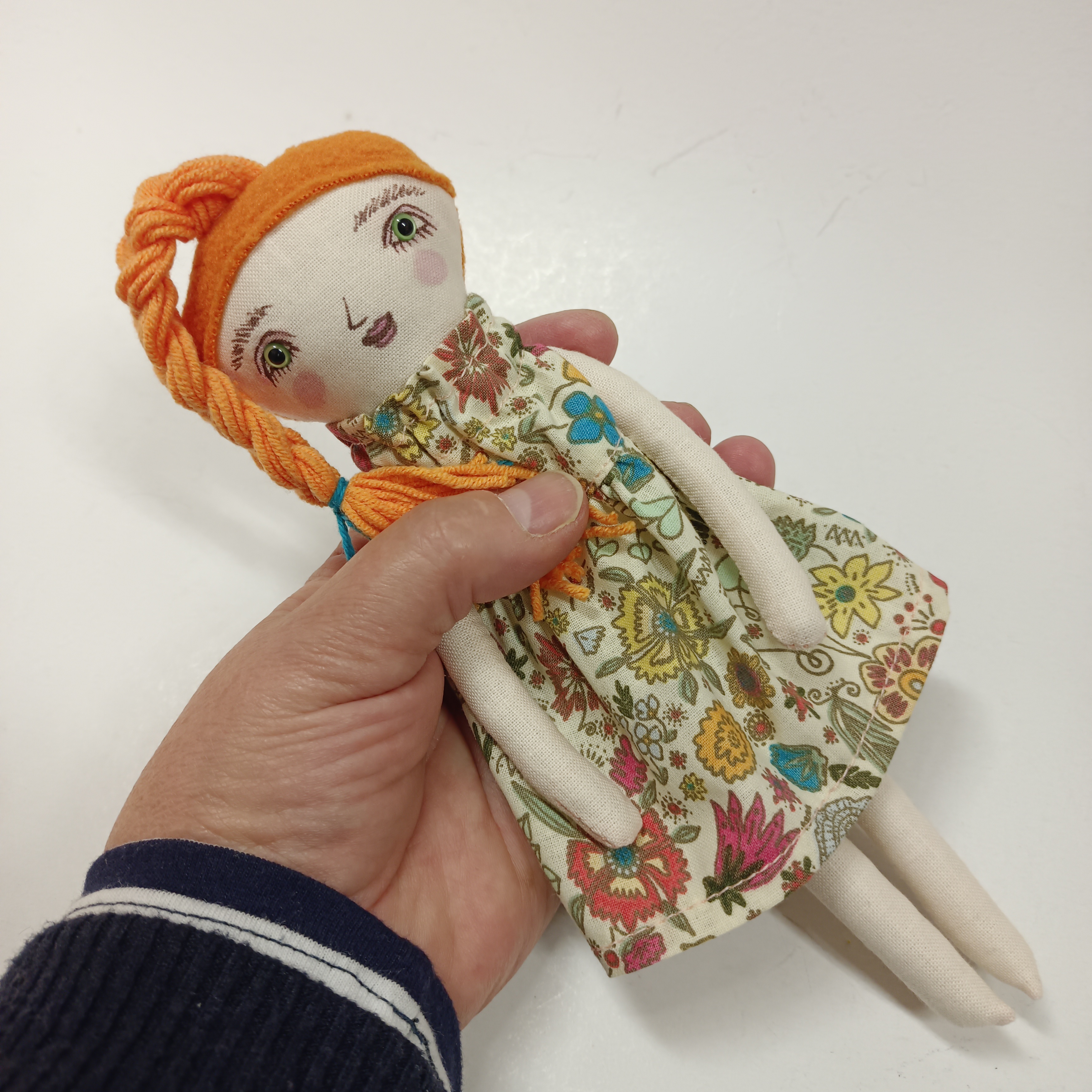 … malá panenka je ušitá z bavlněných látek. Vlasy jsou z fleece a pletací příze a mohou se různě upravovat – culíky, copy, drdůlky, uzly.