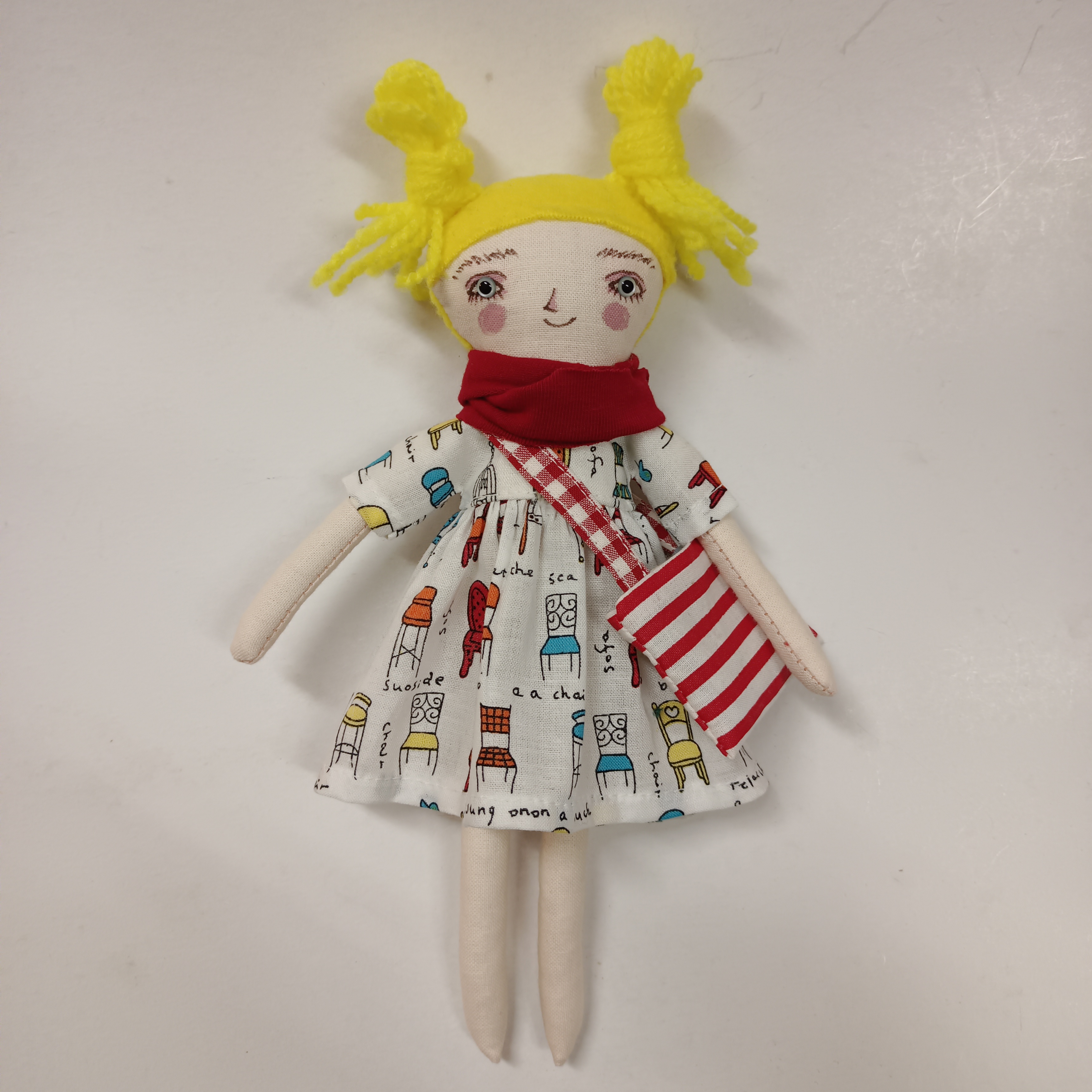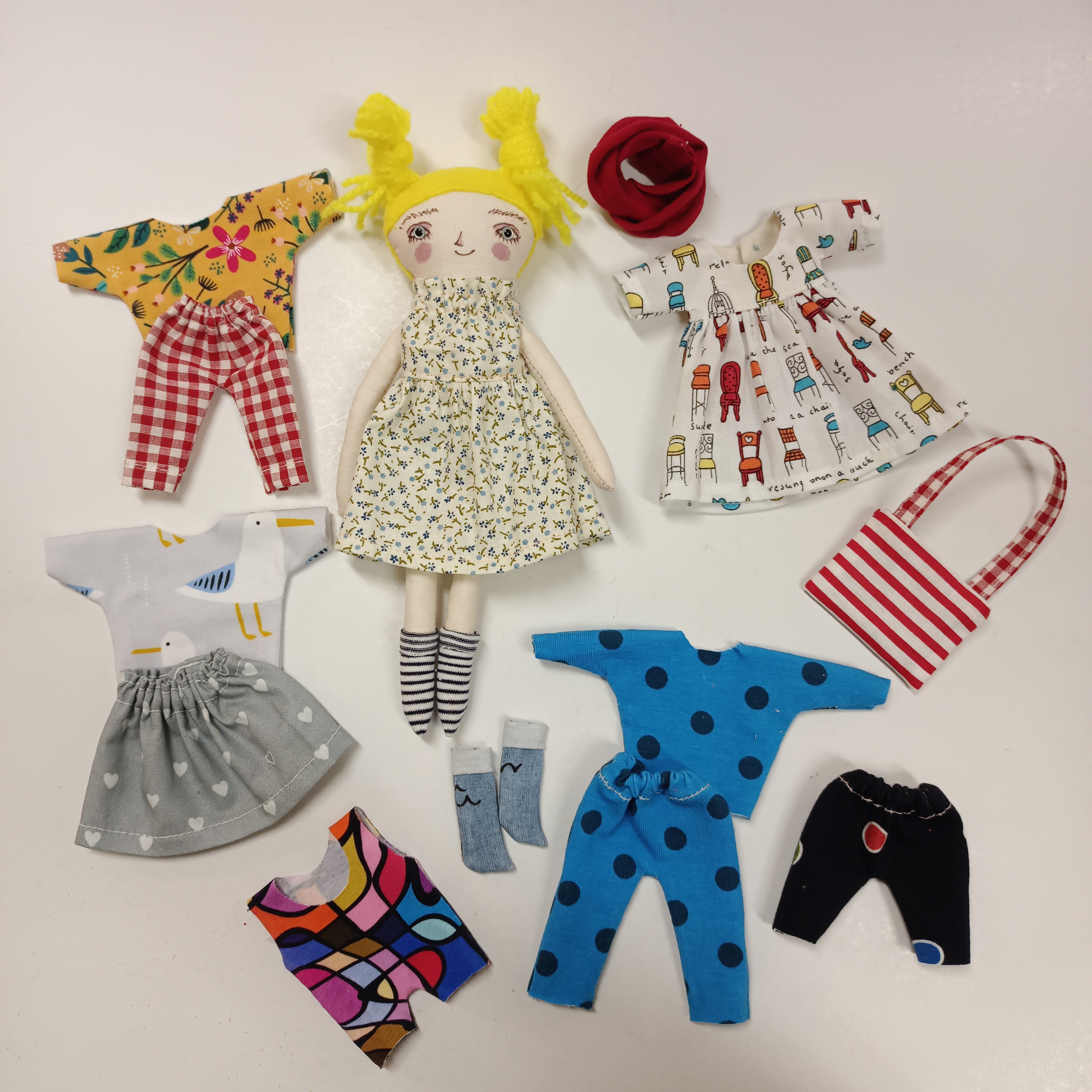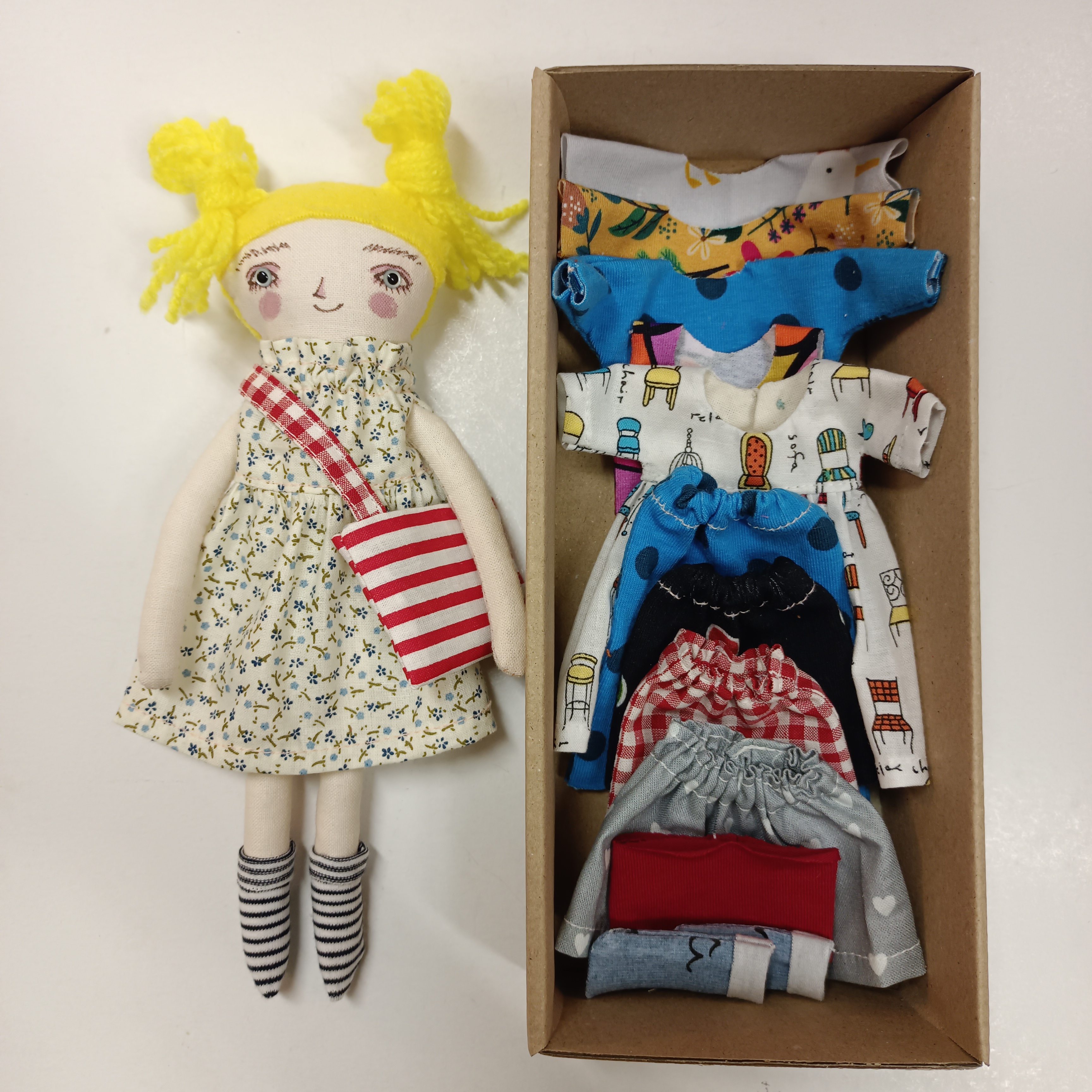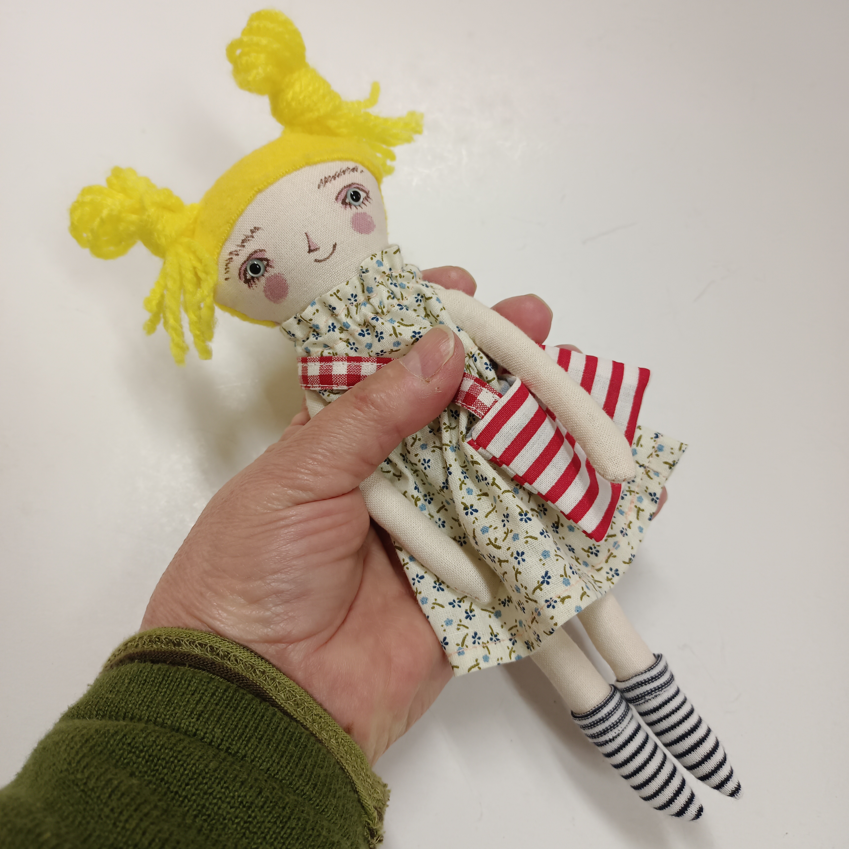… malá panenka je ušitá z bavlněných látek. Vlasy jsou z fleece a pletací příze a mohou se různě upravovat – culíky, copy, drdůlky, uzly.