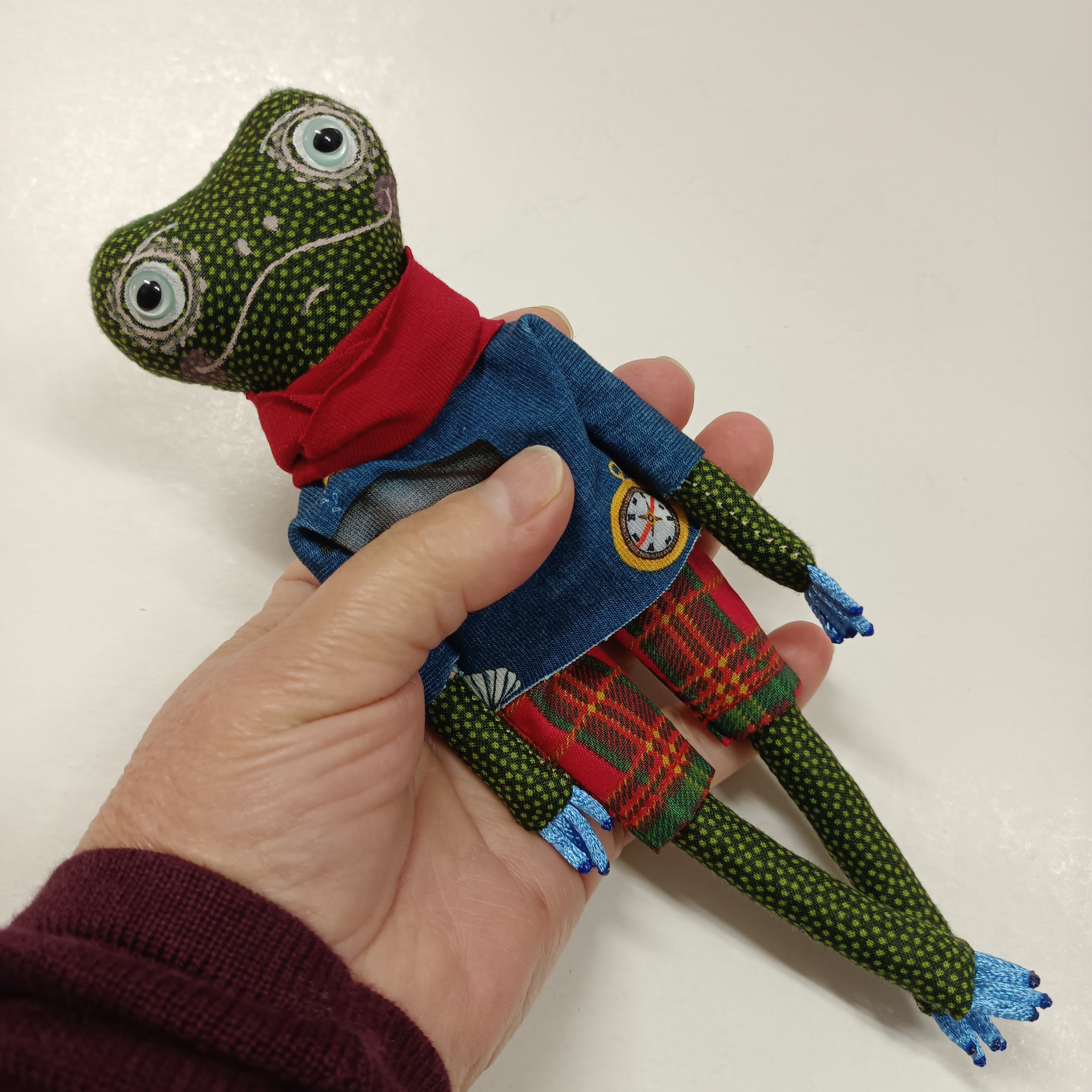 Obličej je namalovaný tuze tenkým štětečkem nezávadnými textilními barvami, které jsou tepelně zafixovány žehličkou. Každá panenka je proto neopakovatelný originál.